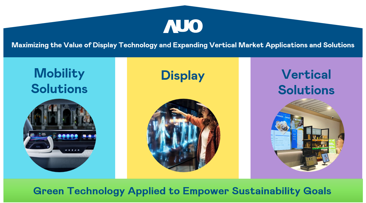 We continue to drive our biaxial transformation strategy, focusing on enhancing the added value of display technologies (Go Premium) and deepening applications in vertical markets (Go Vertical). In response to AUO's competitive advantages and trends, we have established three pillars for sustainable business: Display, Mobility Solutions, and Vertical Solutions. With a solid foundation in display technology, AUO extends diverse solutions across various verticals. Advanced Display technologies benefit the development of Mobility and Vertical solutions, while also utilizing green technology and practices to achieve our vision of sustainable operations throughout the transformation process.